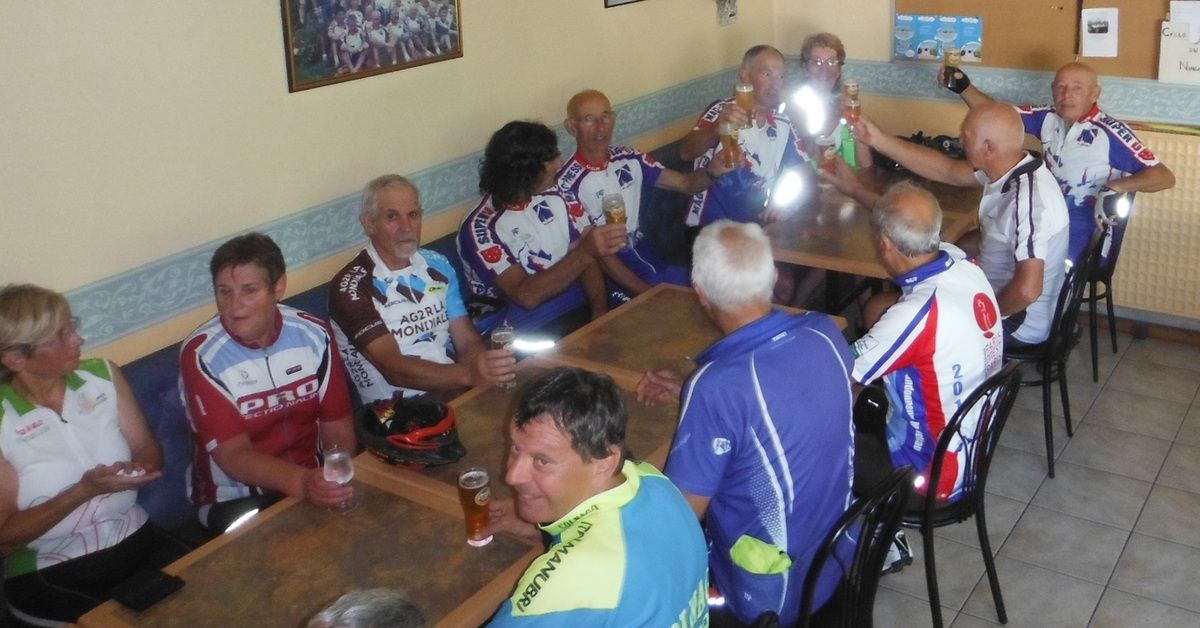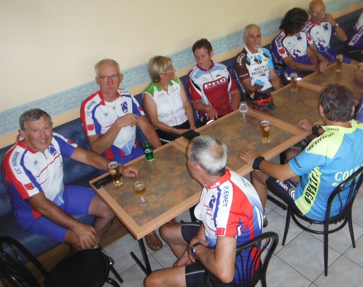 Le groupe s'est scindé en trois. Le plus gros paquet près des toilettes ; André et Jacky au café ; Ernest et Marie-France devant le café, au soleil.